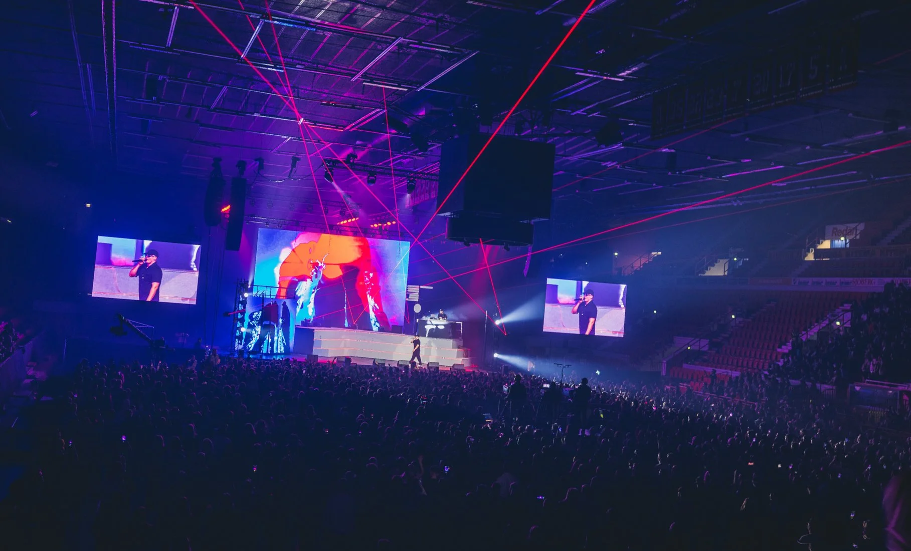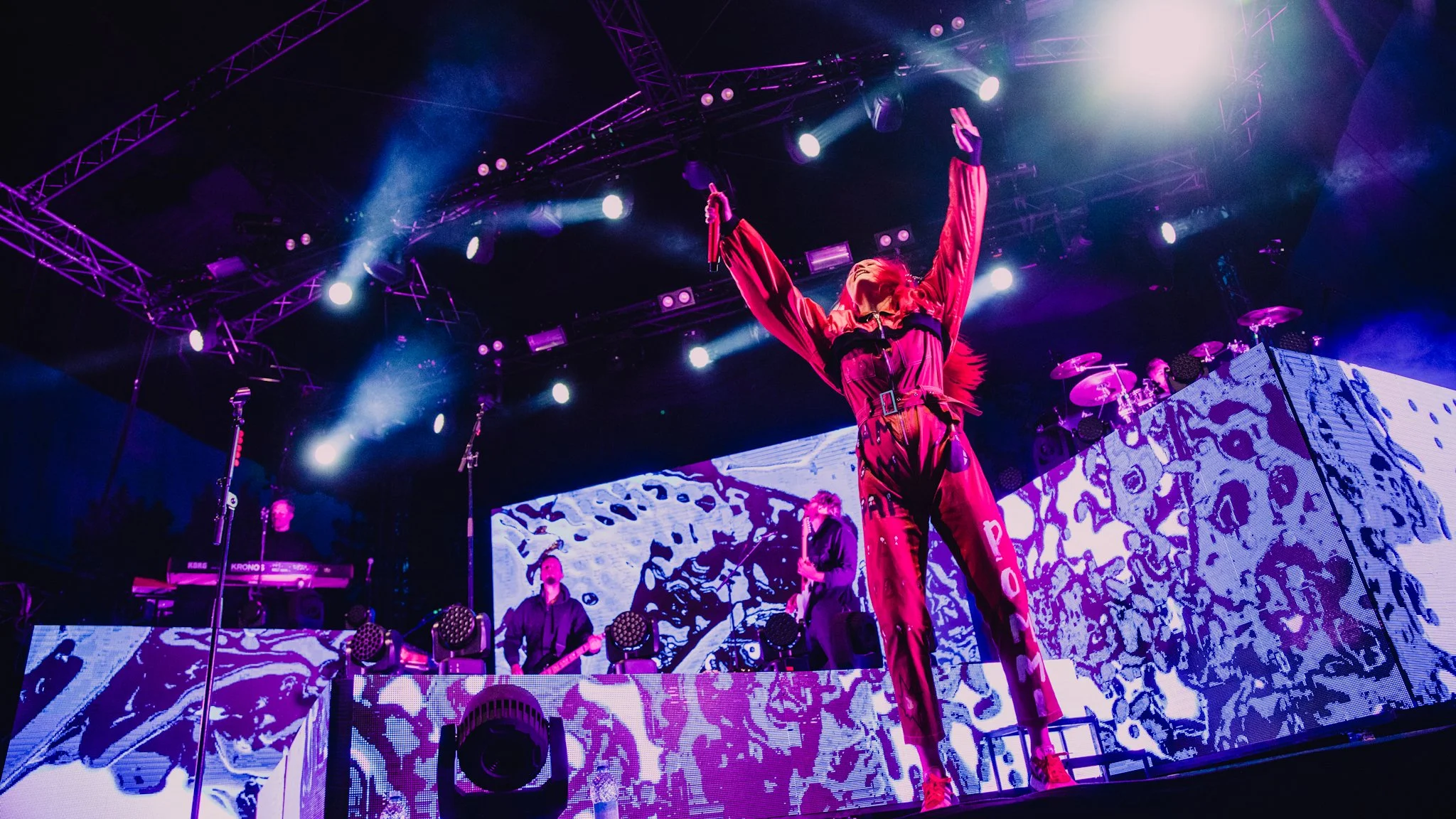 Toteutimme näyttävän kokonaisuuden kiertuetarpeisiin. Skaalautuva ratkaisu toi lavalle visuaalista voimaa jäähallissa ja festareilla.